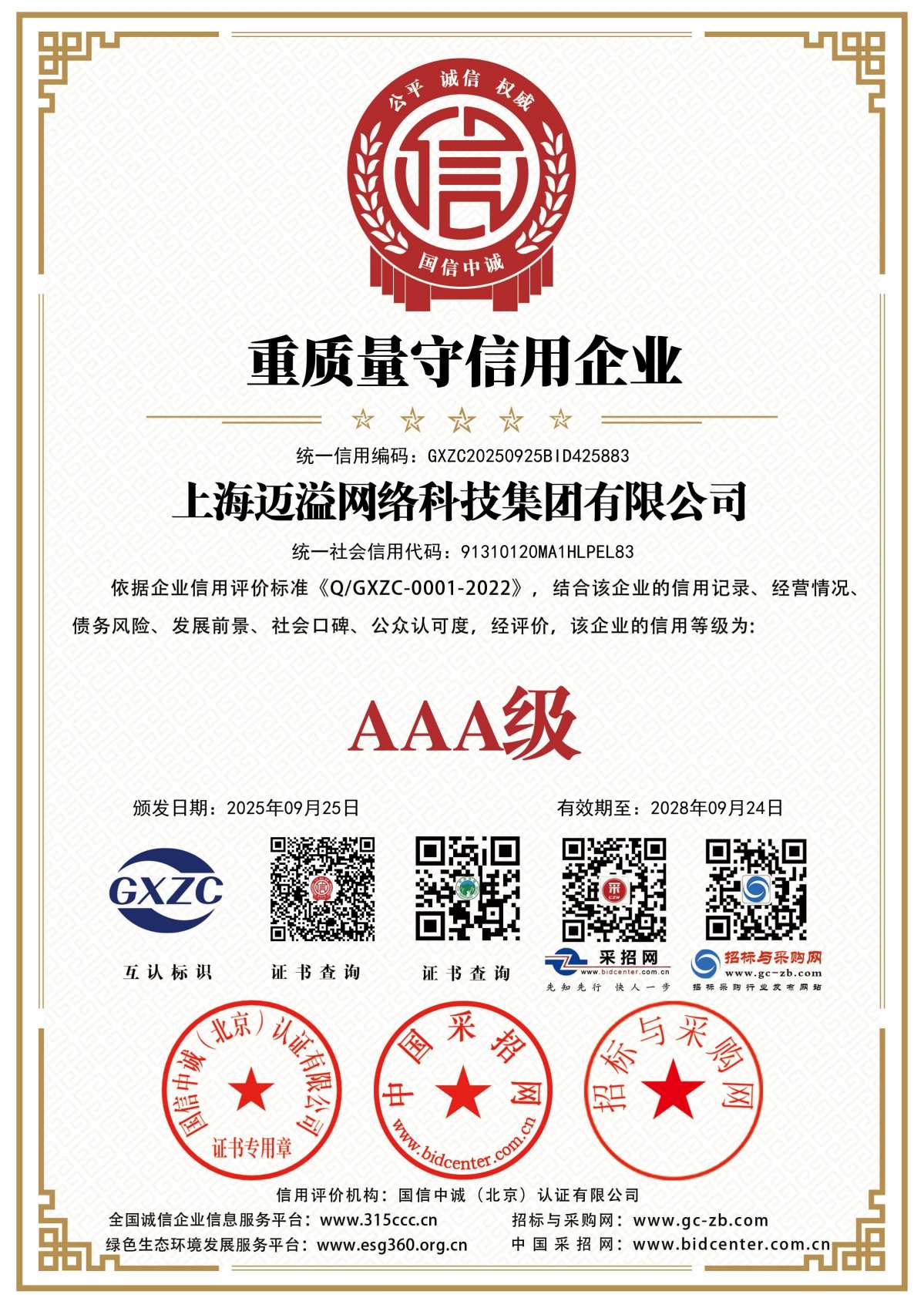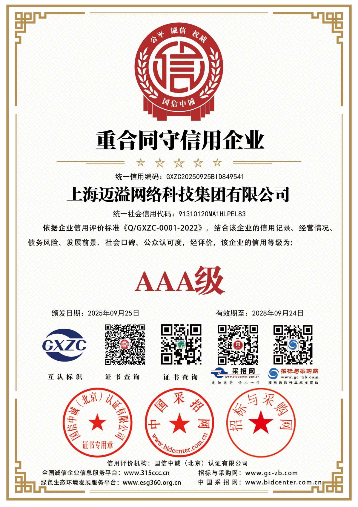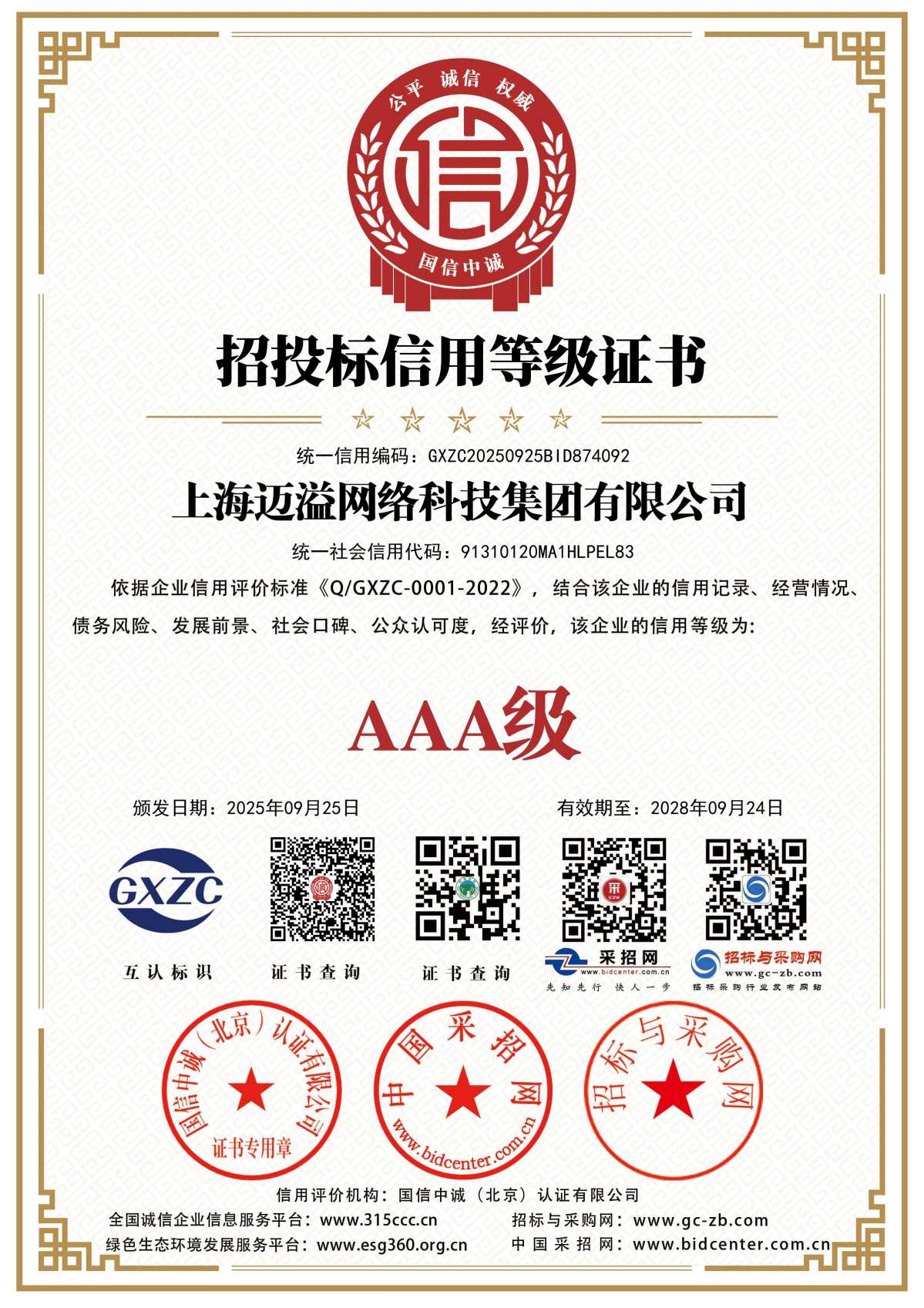 招投标信用等级证书