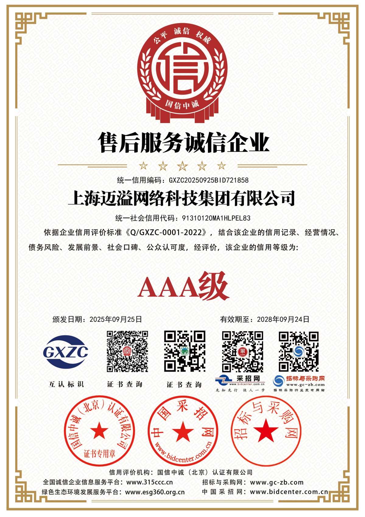 售后服务诚信证书
