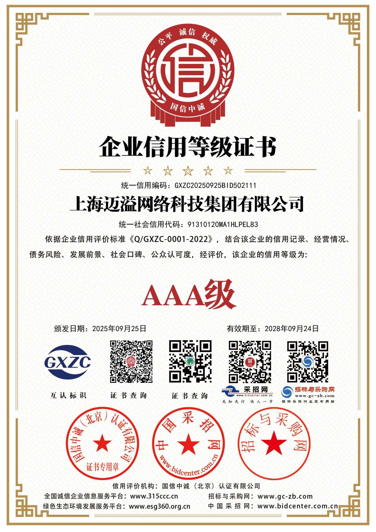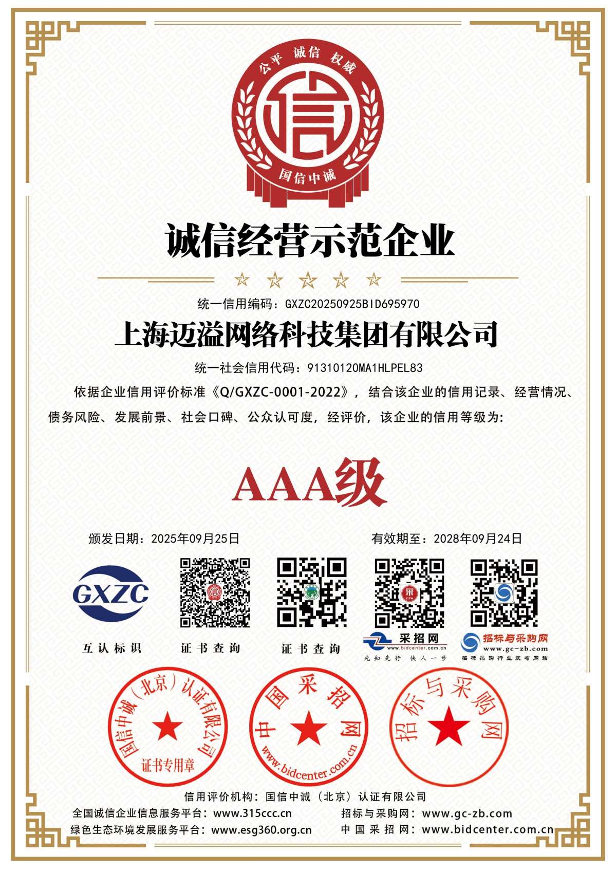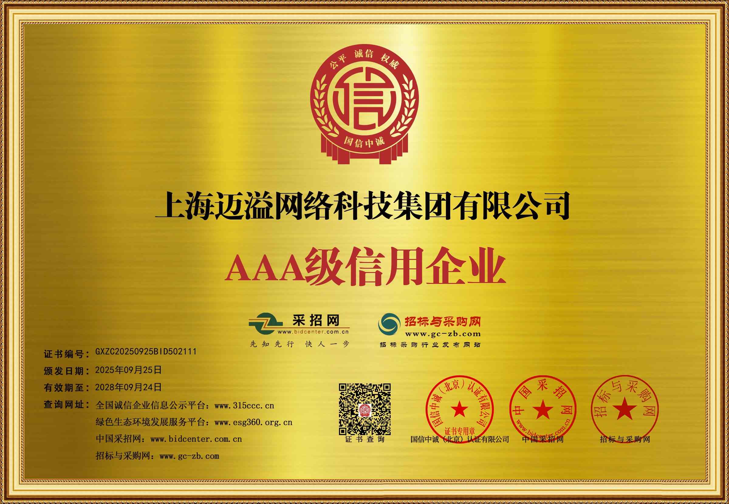 在上海迈溢网络科技集团有限公司,我们深信“诚信”是企业发展的立身之本。我们不仅将这一理念融入日常经营,更通过了国家权威机构的严格评审,有幸连续获得一系列最高级别的AAA级信用认证。这不仅是一份荣誉,更是我们对您作出的郑重承诺——承诺我们的经营透明、可靠、值得托付。